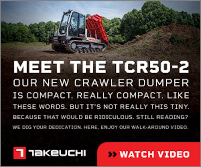 | | | | Sponsored | | With a 180° rotating bed, 65º tip angle and 8,157-lb capacity, when you're working from the big, comfortable cab on Takeuchi's TCR50-2 Crawler Dumper, you don't just get the job done, you make it look easy. |